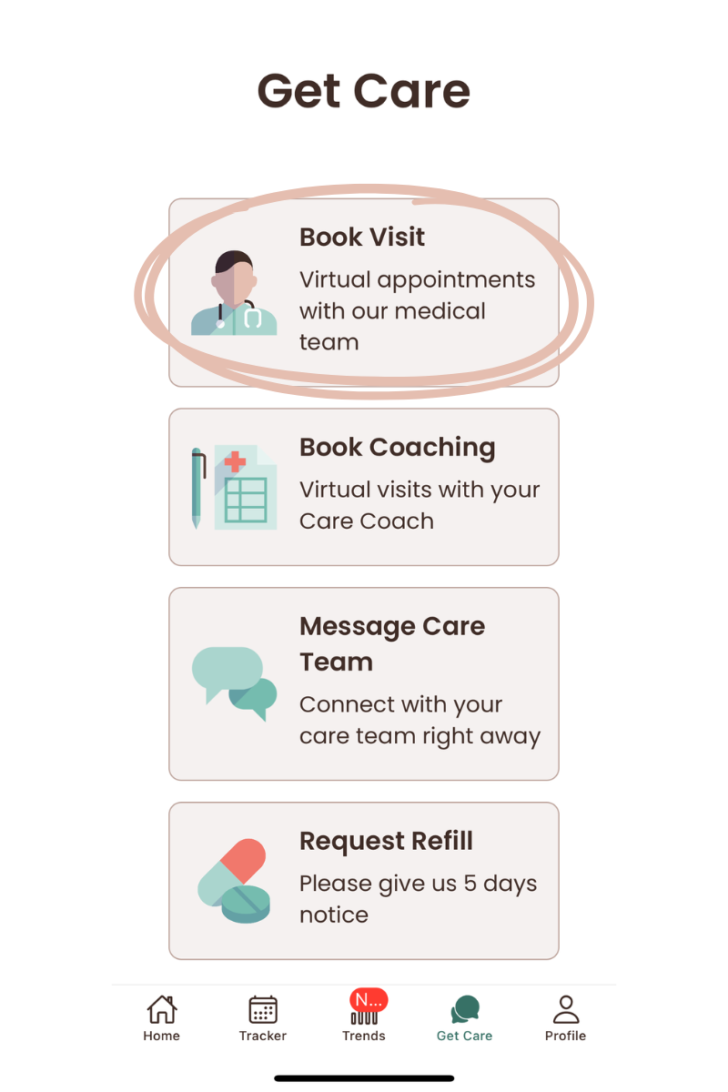 Once you're in the Get Care section, tap on the first option: Book Visit.